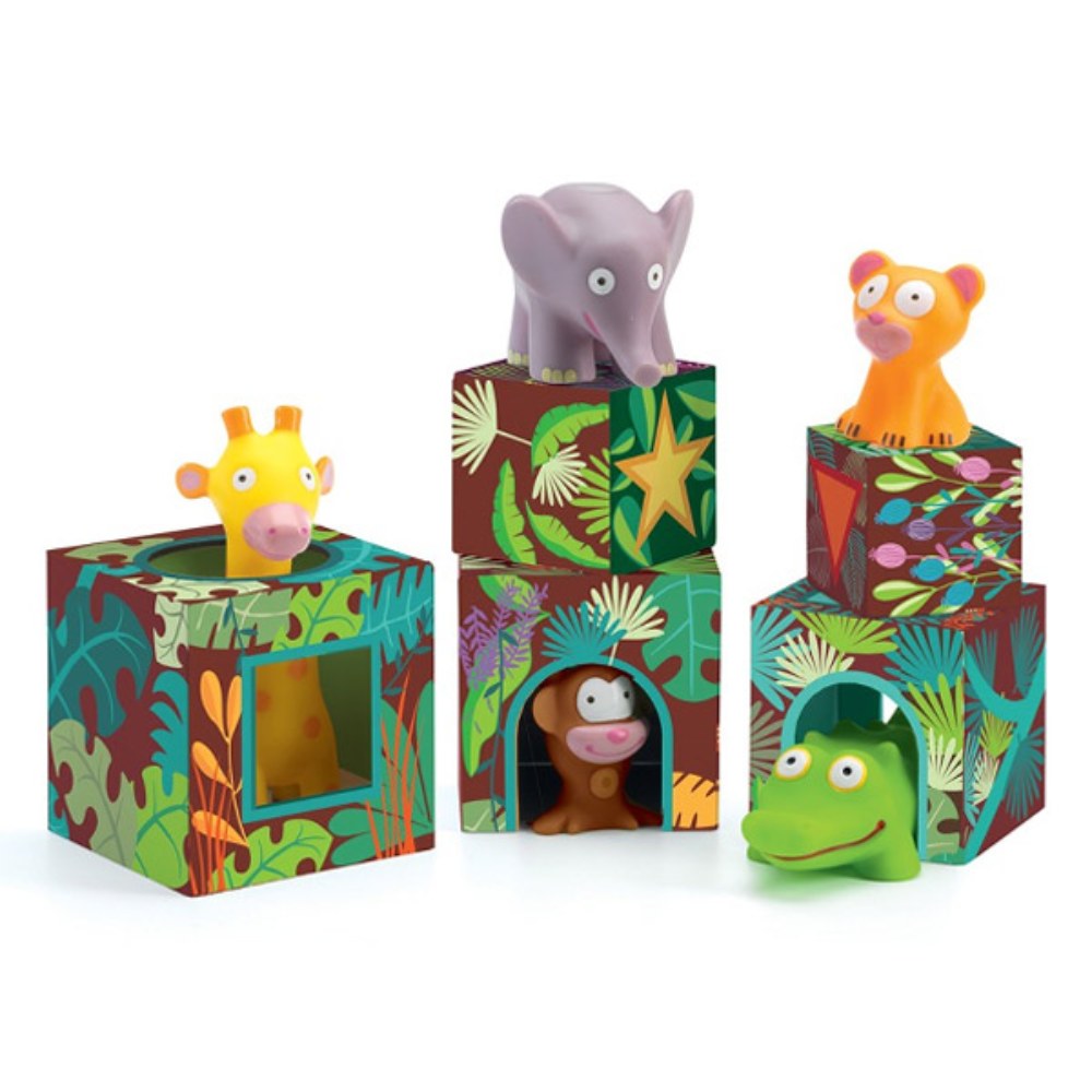 El paquet conté 5 cubs de diferents mides i 5 animals diferents (un elefant, una girafa, un mico, un tigre i un cocodril) de plàstic suau.