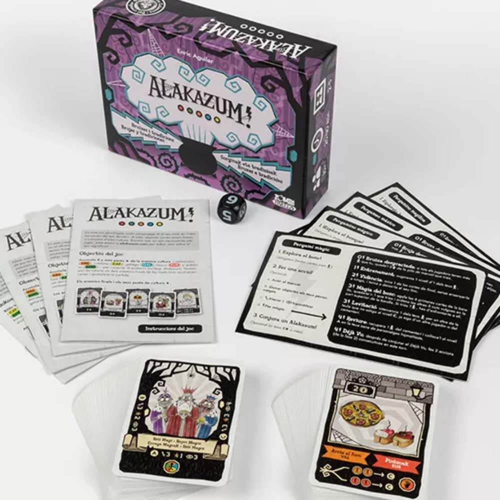 Alakazum! és un joc de cartes de bruixes i tradicions en valencià, castellà, gallec i euskera. Els jugadors hauran de gestionar correctament un llistat de sortilegis, diversos objectes i personatges de cinc cultures diferents per poder enfrontar-se a un enemic final. El jugador que primer derroti amb el seu equip una de les tradicions invasores d’Estats Units guanyarà la partida!