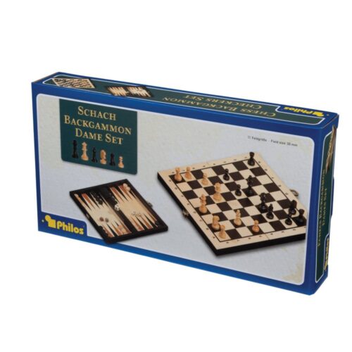 Escacs, dames i backgammon 30 mm, fets de fusta i amb un tauler plegable.