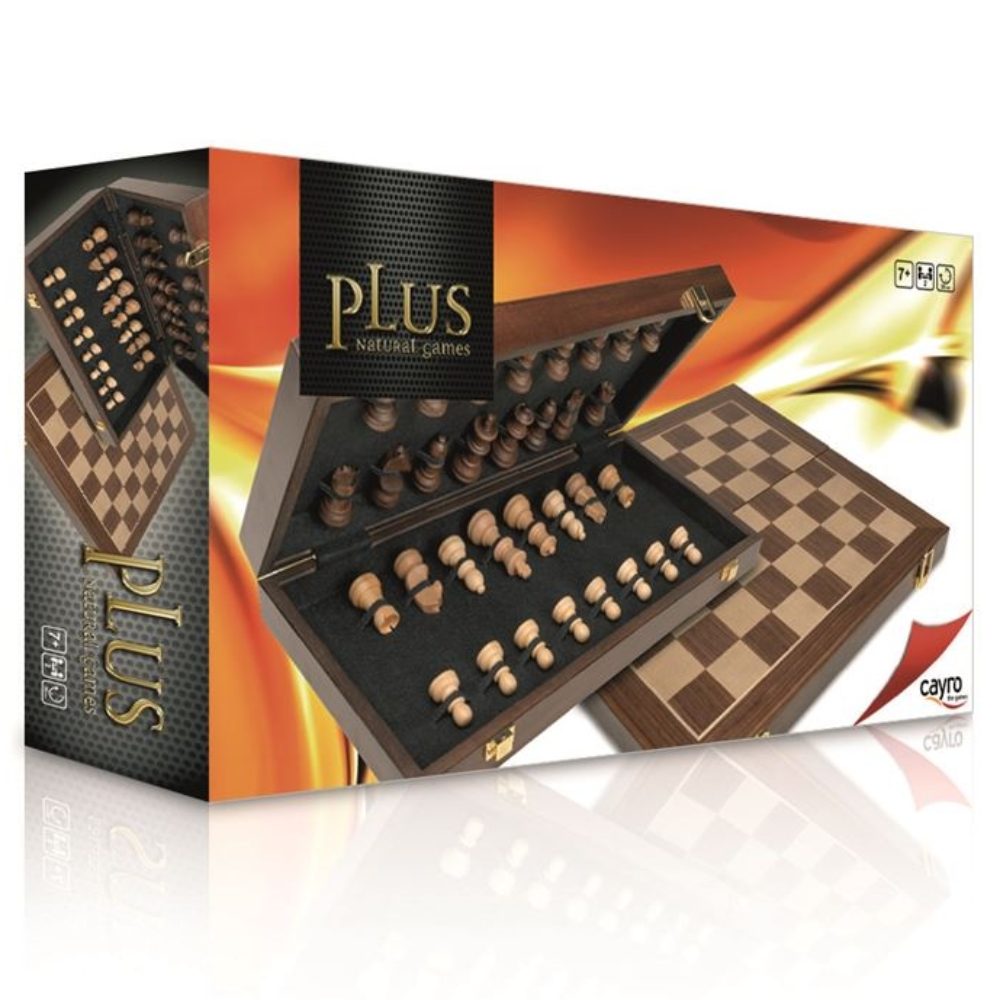 Estoig de fusta plegable amb tauler d’escacs realitzats en marqueteria de 41 x 41 cm. A la part exterior envernissat i a la interior folrada de feltre amb les fitxes de fusta subjectes sobre el feltre per al seu transport.