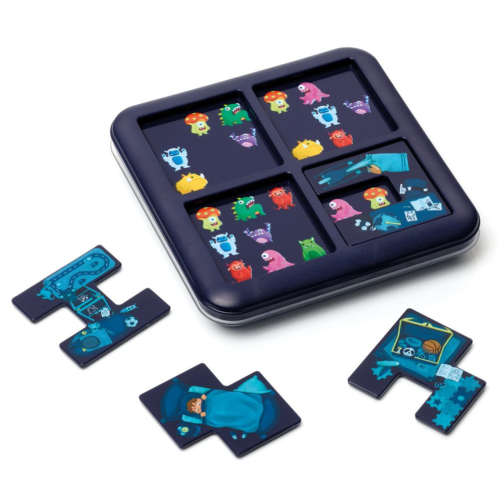 Hi ha monstres sota el llit? Col·loca les quatre peces de trencaclosques al tauler de joc per amagar tots els monstres excepte els que es mostren al repte.