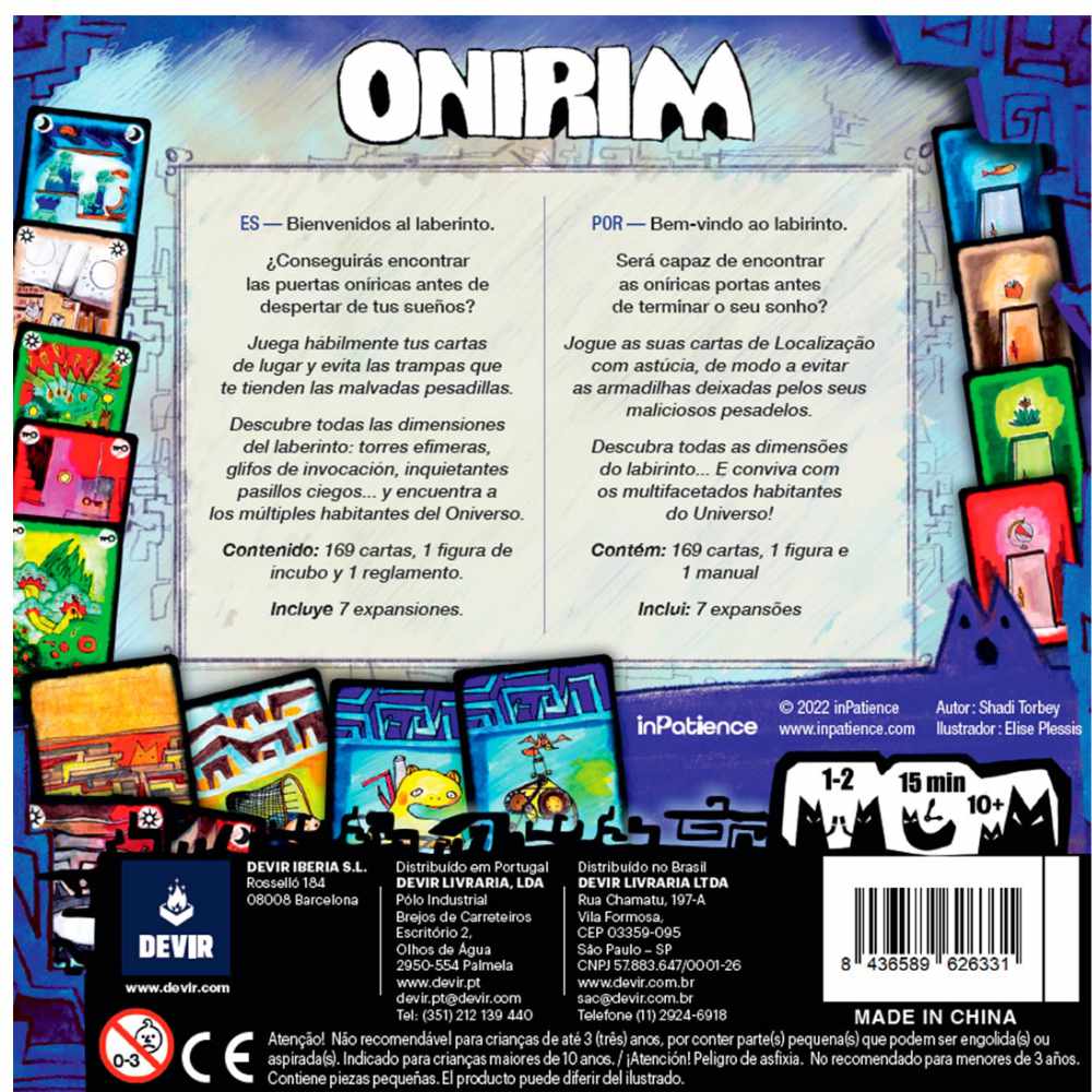 Onirim és un joc en solitari que proposa el jugador a prendre riscos per guanyar. Ideal per portar de viatge i fàcil d’entendre i explicar, permet una gran rejugabilitat gràcies a les múltiples expansions incloses. Enfronta’t al repte oníric del laberint en solitari o en parella, explora les seves càmeres de somni, però afanya’t i no deixis que t’atrapin els malsons… Busca les portes de colors per conquistar la teva llibertat!