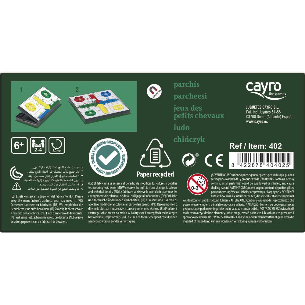 El parxís magnètic de viatge porta un tauler de parxís que es doblega per la meitat per convertir-se en un estoig i així es puguin guardar les fitxes.