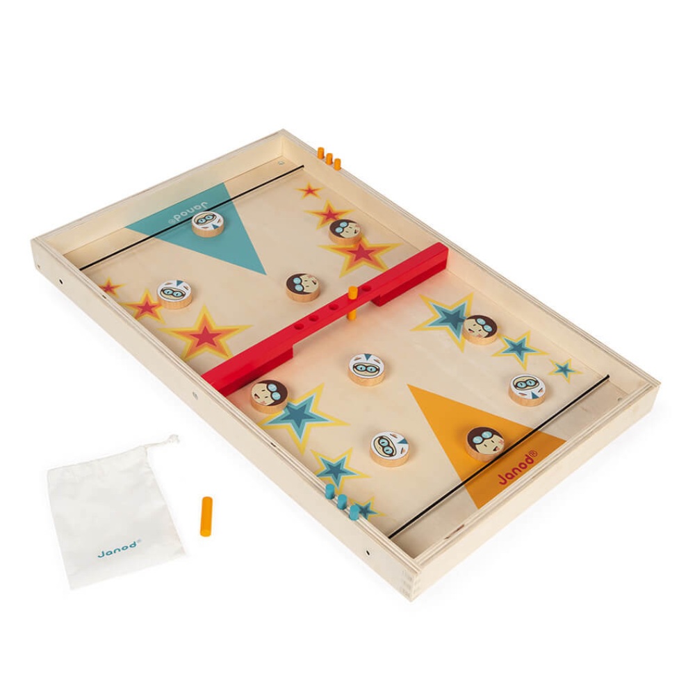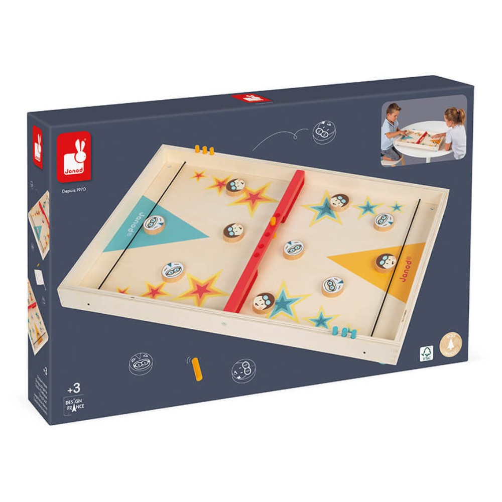 A més de ser divertit, aquest joc també és molt bonic amb la fusta natural i uns tocs de colors alegres. Les fitxes són uns divertits caps de personatges equipats amb cascos per no fer-se mal amb tant llançament.