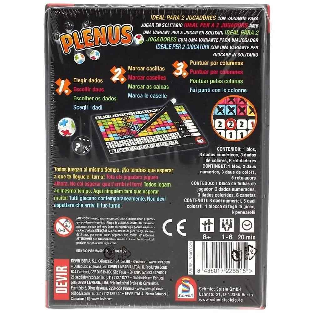 Tira els daus, tria els que prefereixis, marca les caselles i aconsegueix el màxim nombre de punts. Així funciona Plenus, el nou joc de Inka i Markus Brand de regles senzilles i partides trepidants. D’1 a 6 jugadors hauran d’intentar marcar el màxim nombre de caselles en el seu panell intentant ser els primers a omplir les columnes i els espais de colors del seu paper. Però, compte amb deixar-te estrelles pel camí o perdràs punts a final de partida!