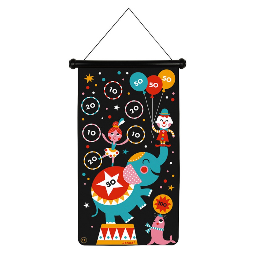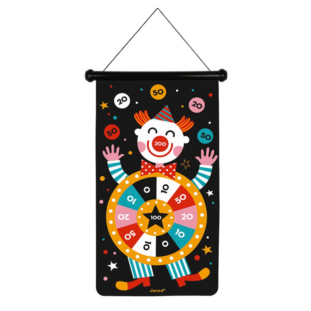 Joc de dards – Circ es tracta d’un joc d’habilitat que consta d’una diana i dards magnètics. Submergiu-vos en una competició envoltada de pallassos, malabars i animals.