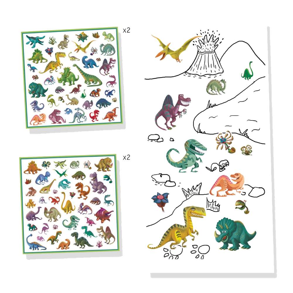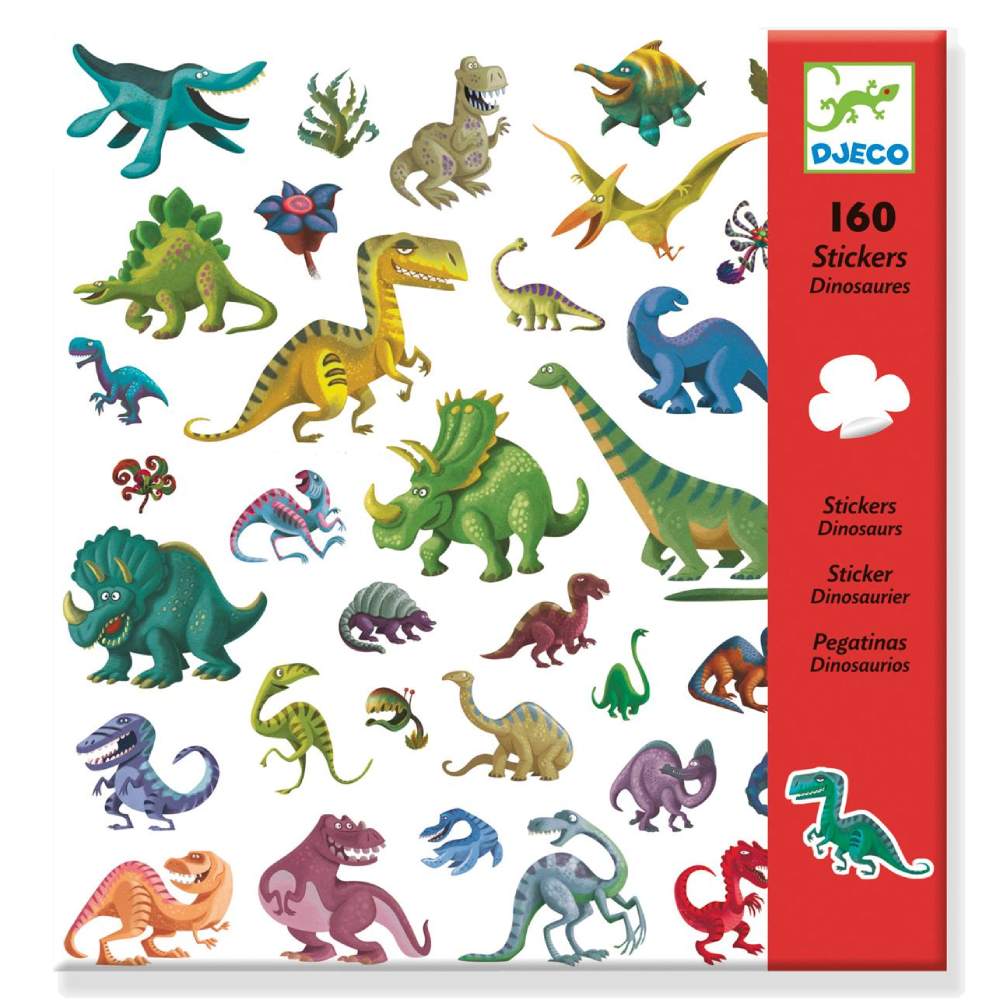 Adhesius Dinosaures conté 4 làmines amb 160 adhesius de dinosaures.