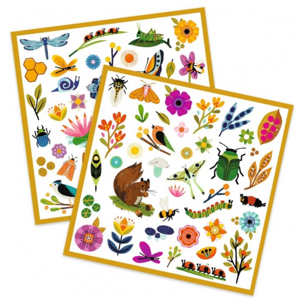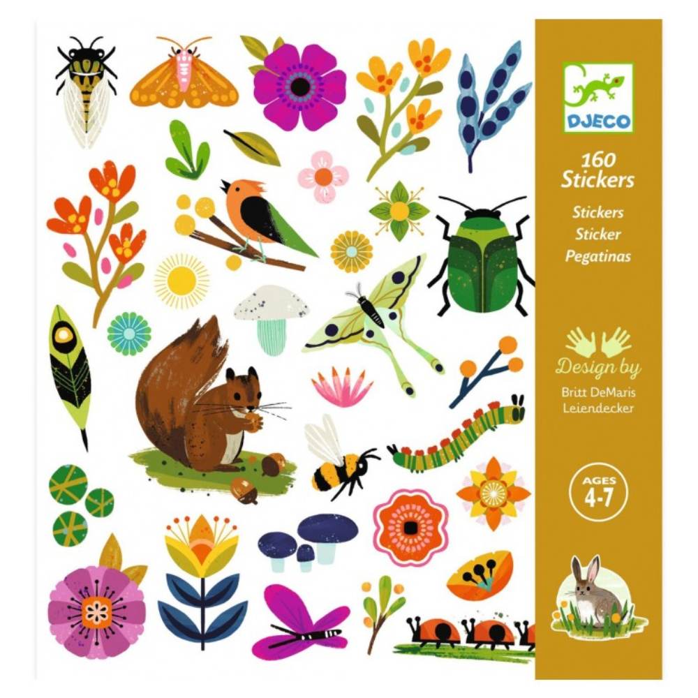 Adhesius Jardí conté 4 làmines amb 160 adhesius d’elements naturals, animals i plantes.